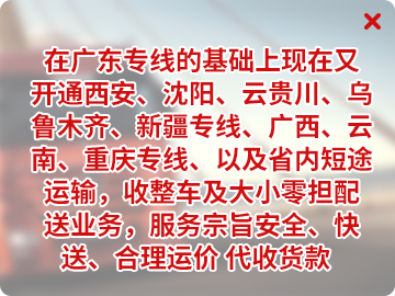 泰安市潤(rùn)邦運(yùn)輸有限公司專(zhuān)門(mén)提供泰安廣州專(zhuān)線(xiàn)、泰安到廣州專(zhuān)線(xiàn)、廣州回程車(chē)運(yùn)輸?shù)鹊?,在廣東專(zhuān)線(xiàn)的基礎(chǔ)上現(xiàn)在又開(kāi)通西安、沈陽(yáng)、云貴川、烏魯木齊、新疆專(zhuān)線(xiàn)、廣西、云南、重慶專(zhuān)線(xiàn)、以及省內(nèi)短途運(yùn)輸,收整車(chē)及大小零擔(dān)配送業(yè)務(wù),服務(wù)宗旨安全、快送、合理運(yùn)價(jià),代收貨款。公司位于泰山腳下,是經(jīng)山東省交通廳、市交通局批準(zhǔn)設(shè)立的單位,組織健全、經(jīng)驗(yàn)豐富、設(shè)施完善,備有大型停車(chē)場(chǎng)、倉(cāng)儲(chǔ)賓館。公司擁有自己的運(yùn)輸隊(duì)伍,手續(xù)齊全,保險(xiǎn)可靠。龐大的運(yùn)輸網(wǎng)絡(luò)使您的貨物更加、快捷地運(yùn)往各地。